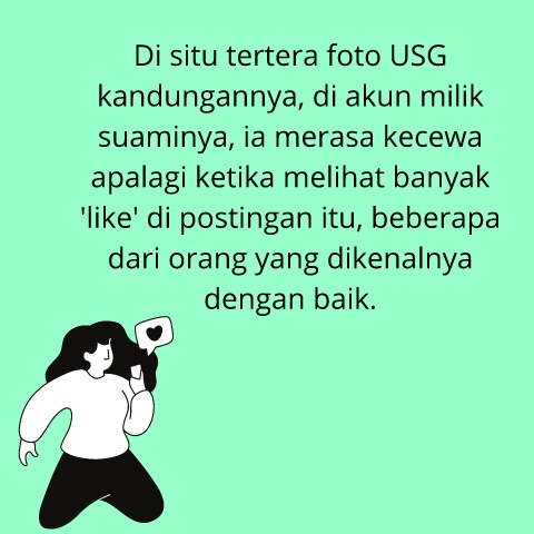 Di situ tertera foto USG kandungannya, di akun milik suaminya, ia merasa kecewa apalagi ketika melihat banyak 'like' di postingan itu, beberapa dari orang yang dikenalnya dengan baik.