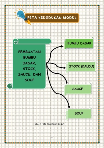 PETA KEDUDUKAN MODUL BUMBU DASAR PEMBUATAN BUMBU DASAR, STOCK (KALDU) STOCK, SAUCE, DAN SOUP SAUCE SOUP Tabel 1. Peta Kedudukan Modul 1