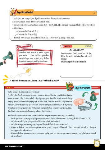 3. Rp20.000,00 x banyak buah jeruk (kg) + Rp15.000,00 x banyak buah apel (kg) = Rp100.000,00