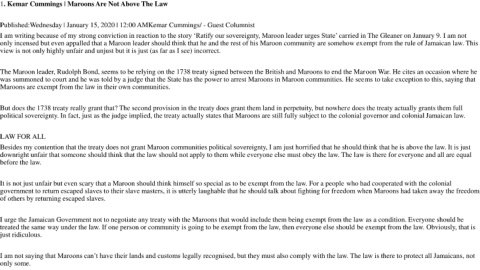 It is not just unfair but even scary that a Maroon should think himself so special as to be exempt from the law. For a people who had cooperated with the colonial