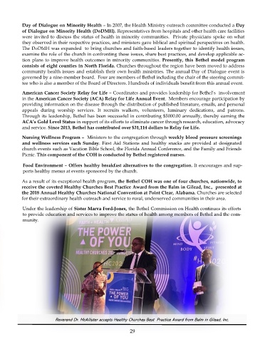 As a result of its exceptional health program, the Bethel COH was one of four churches, nationwide, to