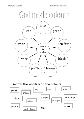 Y0 English – week 10 Correct Words (Grammar) blue red green white yellow Colour the circles orange black purple brown Match the words with the colours. grass sky sun blue green clouds yellow an orange white orange purple tree brown red + blue