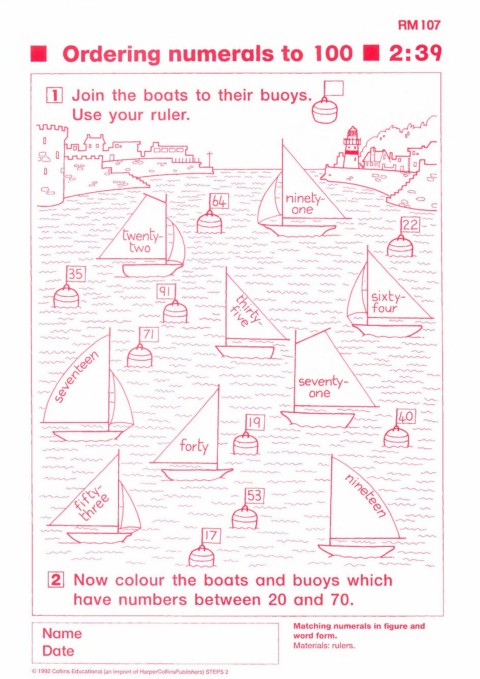 RM107 • Ordering numerals to 100 • 2: 3q rn Join the boats to their buoys.J] Use your ruler. § Matching numerals in figure and Name word form. Date Materials: rulers. © 1992 Col/ins Educational (an imprint of HarperColiinsPublishers) STEPS 2