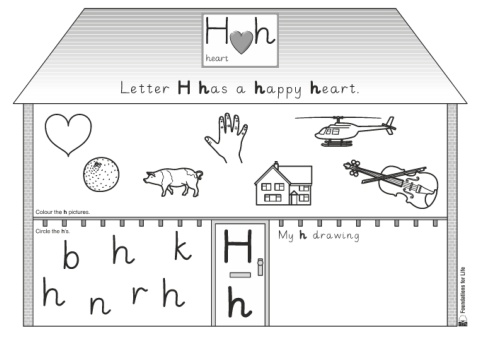 Letter H has a happy heart. Colour the h pictures. Circle the h’s. My h drawing b h k H h n r h h