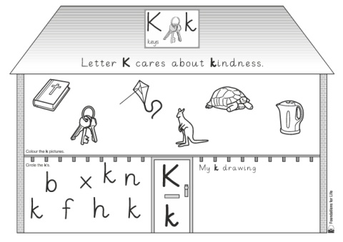 Letter K cares about kindness. Colour the k pictures. Circle the k’s. k My k drawing b x n K k f h k k