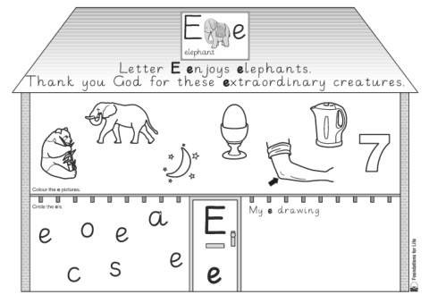 Letter E enjoys elephants. Thank you God for these extraordinary creatures. Colour the e pictures. Circle the e’s. a E My e drawing e o e c s e e