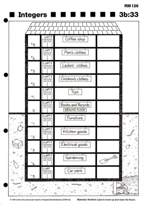 RM126 Integers 3b:33 © 1993 Collins Educational (an imprint of HarperCollinsPublishers) STEPS 3b Materials: Multilink Cube to move up and down the floors
