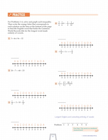 4.31 1 14 6 2 12%u2212 <%u2212 + d d________ 5.1 1 1 14 2%u2212 + %u2265%u2212 + e e________ 6.4 61 39 3h h%uf8eb %uf8f6 %u2212 %uf8ec %uf8f7 %u2212 %u2265%uf8ed %uf8f8________ Longest English word consisting entirely of vowels: ____ ____ ____ ____ ____ ____For Problems 1%u20136, solve and graph each inequality. Then write the orange letter that corresponds to each solution on the lines at the bottom of the page to find the English word that holds the Guinness World Records title for the longest word made entirely of vowels.1. 3 + 4a %u2265 9a %u2013 12________ 2. 2b %u2013 7 < %u20136b %u2013 23________ 3.1 2 3 102 3c c +> %u2212________ PRACTICEProblem: 1 2 3 4 5 6A U I O E A E I U O AA U I O E A E I U O AA U I O E A E I U O AA U I O E A E I U O AA U I O E A E I U O AA U I O E A E I U O AFun Fact: This word is a medieval musical term!%u00a9 GOOD AND BEAUTIFUL 6
