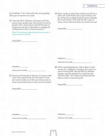 For Problems 7%u201310, write and solve an inequality. Then give an answer in words.7. Amy has three full pans of lasagna and four pieces from another pan. She needs to feed 24 people. How many pieces should the pans of lasagna be cut into so that there is enough for each person to have at least one piece? Hint: The expression representing the total number of pieces must be at least 24.Inequality: ________________Solution: ________Answer in words: ___________________8. Derek read 34 books in the first 12 weeks of the year. How many books does he need to read per week for the rest of the year if he wants to read at least 200 books for the year (52 weeks)?Inequality: ________________Solution: ________Answer in words: ___________________9. Brian wants to make three batches of rolls for a bake sale. Each batch uses f cups of flour, and he will need an additional half cup for dusting his work surface. If he only has five cups of flour, what is the most flour one batch can use?Inequality: ________________Solution: ________Answer in words: ___________________10. Eliza is participating in a ride-a-thon to raise money for a children%u2019s hospital. Her goal is to raise at least $1000. She has $475 in onetime pledges and $21 pledged for each hour she rides her bike. How long must Eliza ride her bike in order to meet her goal?Inequality: ________________Solution: ________Answer in words: ___________________%u00a9 GOOD AND BEAUTIFUL 7 LESSON 91