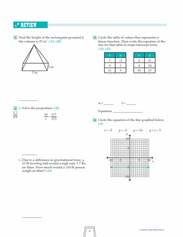 REVIEW3. Circle the table of values that represents a linear function. Then write the equation of the line for that table in slope-intercept form. L39, L43m = ______ b = ______Equation: __________________4. Circle the equation of the line graphed below. L41x = %u20135 y = %u20135 y = %u20135x y = x %u2013 51. Find the height of the rectangular pyramid if the volume is 25 in3. L33, L85____________2. a. Solve the proportion. L6618 117x 273 =_________b. Due to a difference in gravitational force, a 15-lb bowling ball would weigh only 5.7 lbs on Mars. How much would a 110-lb person weigh on Mars? L66____________5 in3 inx y7 %u201329 111 5x y2 114 1410 23%u00a9 GOOD AND BEAUTIFUL 8