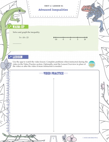 LESSONWARM-UPUse the app to watch the video lesson. Complete problems when instructed during the video in the Video Practice section. Optionally, read the Lesson Overview in place of the video or after the video if more instruction is needed.VIDEO PRACTICESolve and graph the inequality. 5r + 18 > 23 __________%u00a9 GOOD AND BEAUTIFUL 2UNIT 4 | LESSON 91Advanced Inequalities