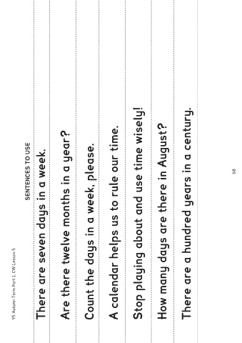 SENTENCES TO USE There are seven days in a week. Are there twelve months in a year? Count the days in a week, please. A calendar helps us to rule our time. Stop playing about and use time wisely! How many days are there in August? There are a hundred years in a century. 68