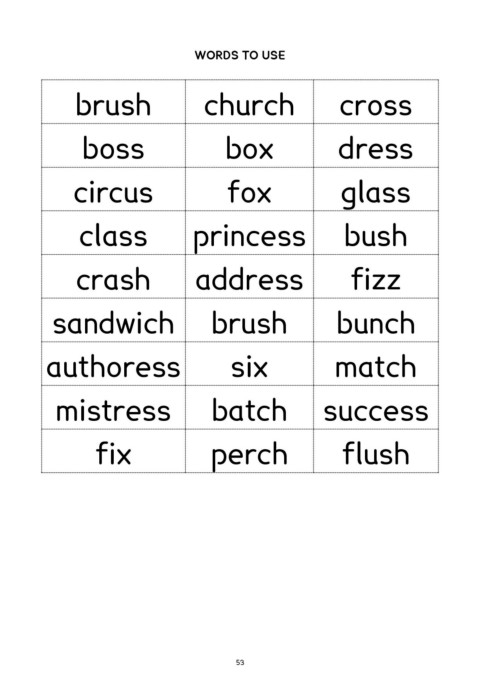 WORDS TO USE brush church cross boss box dress circus fox glass class princess bush crash address fizz sandwich brush bunch authoress six match mistress batch success fix perch flush 53