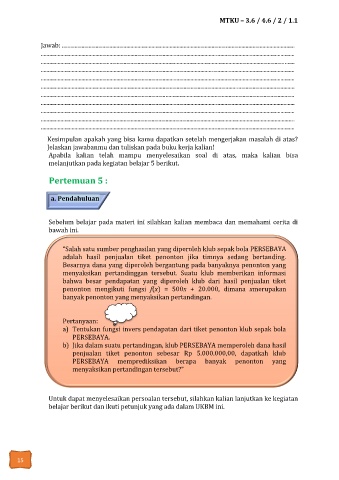 a) Tentukan fungsi invers pendapatan dari tiket penonton klub sepak bola