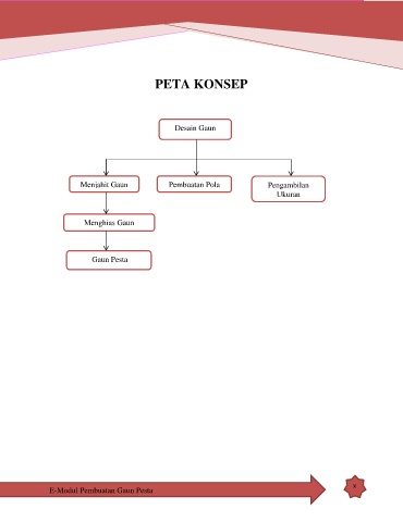 PETA KONSEP Desain Gaun Menjahit Gaun Pembuatan Pola Pengambilan Ukuran Menghias Gaun Gaun Pesta x E-Modul Pembuatan Gaun Pesta