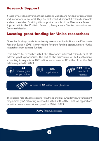Given the funding crunch for university research in South Africa, the Directorate Research Support (DRS) is ever-vigilant for grant-funding opportunities for Unisa researchers from external funders.