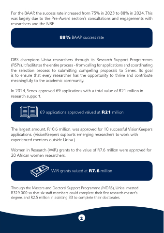 In 2024, Senex approved 69 applications with a total value of R21 million in research support.