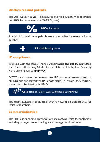 Working with the Unisa Finance Department, the DITTC submitted the Unisa Full Costing Model to the National Intellectual Property Management Office (NIPMO).