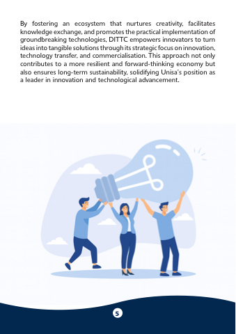 By fostering an ecosystem that nurtures creativity, facilitates knowledge exchange, and promotes the practical implementation of groundbreaking technologies, DITTC empowers innovators to turn ideas into tangible solutions through its strategic focus on innovation, technology transfer, and commercialisation. This approach not only contributes to a more resilient and forward-thinking economy but also ensures long-term sustainability, solidifying Unisa’s position as a leader in innovation and technological advancement.