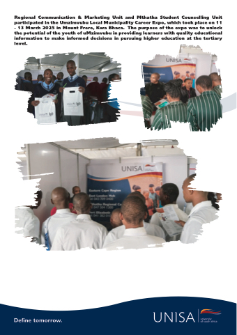 Regional Communication & Marketing Unit and Mthatha Student Counselling Unit participated in the Umzimvubu Local Municipality Career Expo, which took place on 11 - 13 March 2025 in Mount Frere, Kwa Bhaca. The purpose of the expo was to unlock the potential of the youth of uMzimvubu in providing learners with quality educational information to make informed decisions in pursuing higher education at the tertiary level.