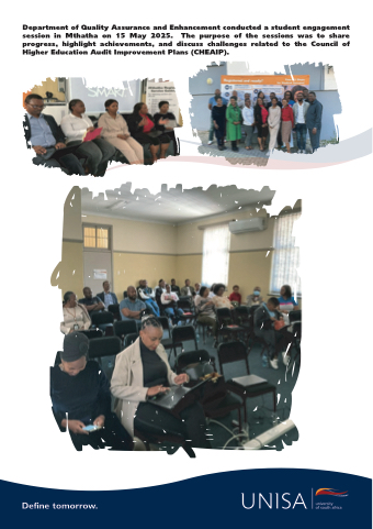 Department of Quality Assurance and Enhancement conducted a student engagement session in Mthatha on 15 May 2025. The purpose of the sessions was to share progress, highlight achievements, and discuss challenges related to the Council of Higher Education Audit Improvement Plans (CHEAIP).