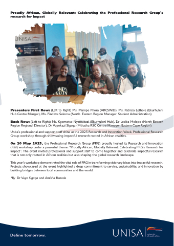 Unisa’s professional and support staff shine at the 2025 Research and Innovation Week, Professional Research Group workshop through showcasing impactful research rooted in African realities.