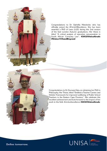 Congratulations to Dr Dumaza Faku on obtaining her PhD in Philosophy. Her Thesis, titled “Entitled a Teacher-Centric and Holistic Framework for improved wellbeing of Public School Teachers in the Eastern Cape Province”. We celebrate this excellent achievement and look forward to the impact of her work in the field. #circleofexcellence #2025UnisaGrads