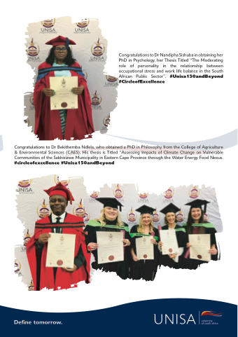 Congratulations to Dr Nandipha Sishuba in obtaining her PhD in Psychology, her Thesis Titled “The Moderating role of personality in the relationship between occupational stress and work life balance in the South African Public Sector”. #Unisa150andBeyond #CircleofExcellence