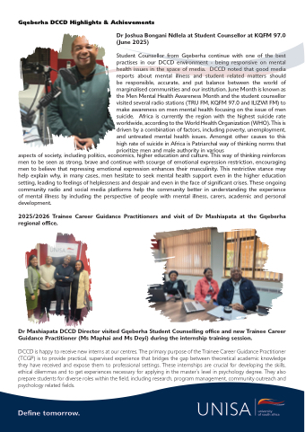 Student Counsellor from Gqeberha continue with one of the best practises in our DCCD environment - being responsive on mental health issues in the space of media. DCCD noted that good media reports about mental illness and student related matters should be responsible, accurate, and put balance between the world of marginalised communities and our institution. June Month is known as the Men Mental Health Awareness Month and the student counsellor visited several radio stations (TRU FM, KQFM 97.0 and ILIZWI FM) to make awareness on men mental health focusing on the issue of men suicide. Africa is currently the region with the highest suicide rate worldwide, according to the World Health Organization (WHO). This is driven by a combination of factors, including poverty, unemployment, and untreated mental health issues. Amongst other causes to this high rate of suicide in Africa is Patriarchal way of thinking norms that prioritize men and male authority in various