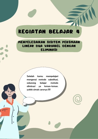 KEGIATAN BELAJAR 4 MENYELESAIKAN SISITEM PERSMAAN LINEAR DUA VARIABEL DENGAN ELIMINASI Setelah kamu mempelajari mengenai metode substitusi, sekarang belajar metode eliminasi ya teman-teman. yukkk simak caranya !!!!!