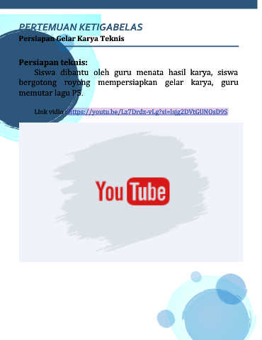 PERTEMUAN KETIGABELAS Persiapan Gelar Karya Teknis Persiapan teknis: Siswa dibantu oleh guru menata hasil karya, siswa bergotong royong mempersiapkan gelar karya, guru memutar lagu P5. Link vidio : https://youtu.be/Lz7Drdz-vLg?si=lsjg2DVtGUNOsD9S