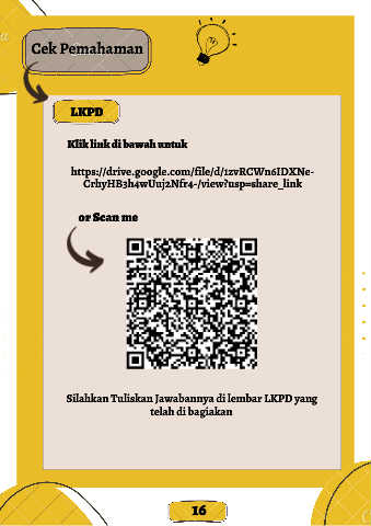 Cek Pemahaman LKPD Klik link di bawah untuk https://drive.google.com/file/d/1zvRCWn6IDXNe- CrhyHB3h4wUuj2Nfr4-/view?usp=share_link or Scan me Silahkan Tuliskan Jawabannya di lembar LKPD yang telah di bagiakan 16