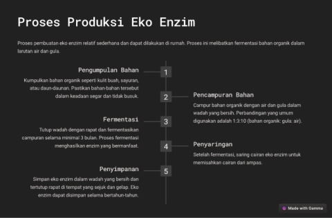 Proses pembuatan eko enzim relatif sederhana dan dapat dilakukan di rumah. Proses ini melibatkan fermentasi bahan organik dalam