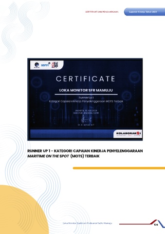 SERTIFIKAT DAN PENGHARGAAN Laporan Kinerja Tahun 2024 RUNNER UP 1 - KATEGORI CAPAIAN KINERJA PENYELENGGARAAN MARITIME ON THE SPOT (MOTS) TERBAIK Loka Monitor Spektrum Frekuensi Radio Mamuju 136