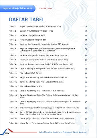 Tabel 8. Perjanjian Kinerja Loka Monitor SFR Mamuju Tahun 2024 20 Tabel 30. Benchmark Capaian Persentase Berfungsinya Perangkat Pendukung SMFR 58