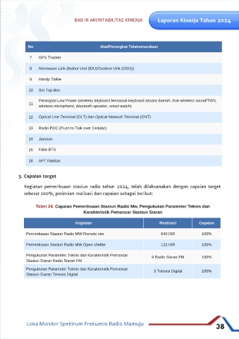 telekomunikasi dilakukan terhadap dalam setiap kegiatan minimal terdiri atas Tabel 24. Capaian Pemeriksaan Stasiun Radio Mw, Pengukuran Parameter Teknis dan