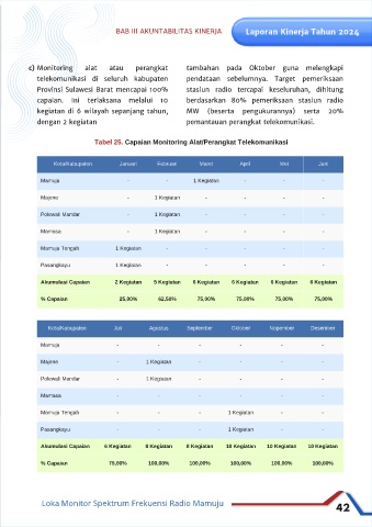 capaian sebesar 100%. kabupaten/kota provinsi Sulawesi Barat, Tabel 25. Capaian Monitoring Alat/Perangkat Telekomunikasi