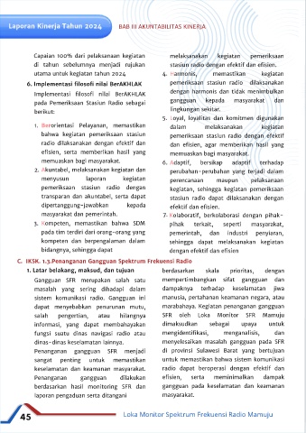 6. Implementasi filosofi nilai BerAKHLAK pemeriksaan stasiun radio dilaksanakan 100% jumlah aduan gangguan SFR penggunaan frekuensi RAPI 143.22 MHz oleh