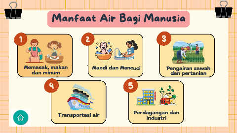 Manfaat Air Bagi Manusia Memasak, makan Mandi dan Mencuci Pengairan sawah dan minum dan pertanian Perdagangan dan Transportasi air Industri