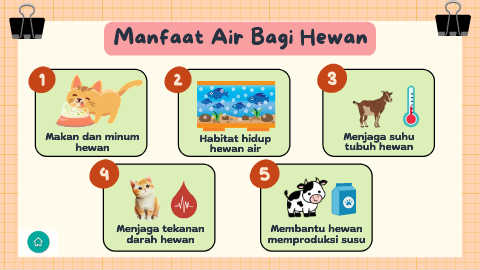 Manfaat Air Bagi Hewan Makan dan minum Habitat hidup Menjaga suhu hewan hewan air tubuh hewan Menjaga tekanan Membantu hewan darah hewan memproduksi susu