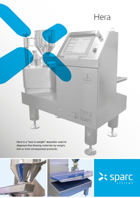 Hera Hera is a “loss-in-weight” depositor used to dispense free-flowing materials by weight, into or onto conveyorised products.