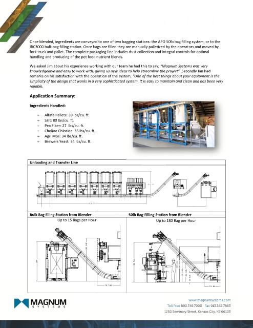 Once blendded, ingredients are conveyeed to one of twwo bagging stattions: the APO 50lb bag fillingg system, or too the