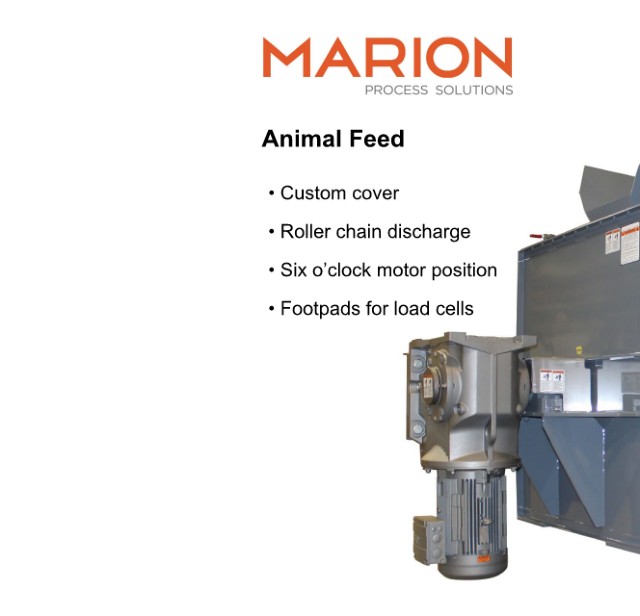 Mineral Animal Feed • Custom cover • Roller chain discharge • Six o’clock motor position • Footpads for load cells 14070
