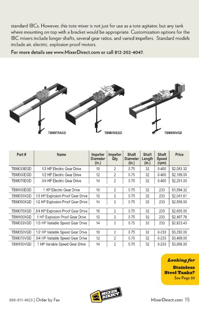 IBC mixers include longer shafts, several gear ratios, and varied impellers. Standard models