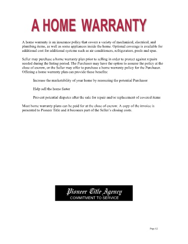 close of escrow, or the Seller may offer to purchase a home warranty policy for the Purchaser.