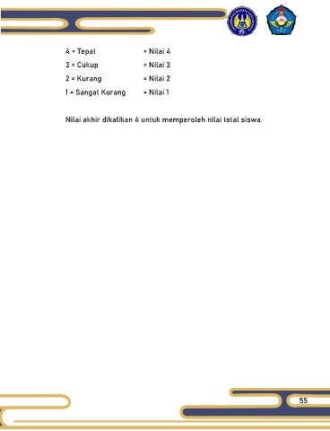 4 = Tepat = Nilai 4 3 = Cukup = Nilai 3 2 = Kurang = Nilai 2 1 = Sangat Kurang = Nilai 1 Nilai akhir dikalikan 4 untuk memperoleh nilai total siswa. 55
