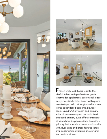 French white oak floors lead to the chefs kitchen with professional grade Thermador appliances, custom oak cabi- netry, oversized center island with quartz countertops and custom glass wine room. Three secondary bedrooms, powder room, laundry/utility room and primary suite all conveniently on the main level. Secluded primary suite offers sensation- al views from its private deck. Luxurious primary bathroom has custom oak vanity with dual sinks and brass fixtures, large oval soaking tub, oversized shower and two walk in closets.
