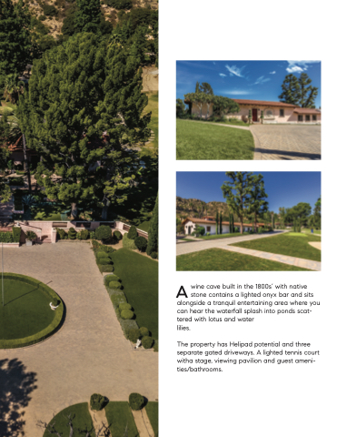 The property has Helipad potential and three separate gated driveways. A lighted tennis court witha stage, viewing pavilion and guest ameni- ties/bathrooms.