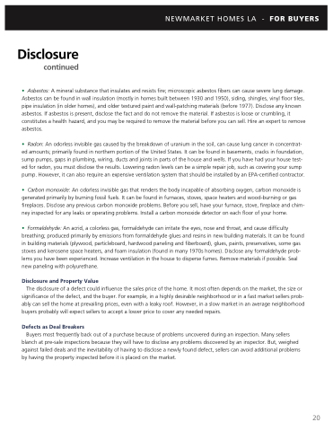 • Radon: An odorless invisible gas caused by the breakdown of uranium in the soil, can cause lung cancer in concentrat- ed amounts; primarily found in northern portion of the United States. It can be found in basements, cracks in foundation, sump pumps, gaps in plumbing, wiring, ducts and joints in parts of the house and wells. If you have had your house test- ed for radon, you must disclose the results. Lowering radon levels can be a simple repair job, such as covering your sump pump. However, it can also require an expensive ventilation system that should be installed by an EPA-certified contractor.