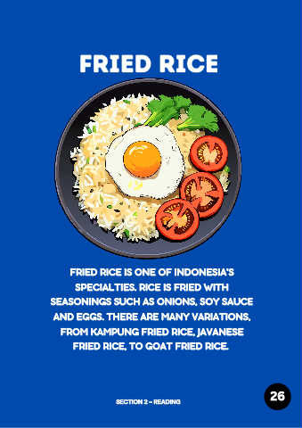 FRIED RICE FRIED RICE IS ONE OF INDONESIA'S SPECIALTIES. RICE IS FRIED WITH SEASONINGS SUCH AS ONIONS, SOY SAUCE AND EGGS. THERE ARE MANY VARIATIONS, FROM KAMPUNG FRIED RICE, JAVANESE FRIED RICE, TO GOAT FRIED RICE. 26 SECTION 2 - READING